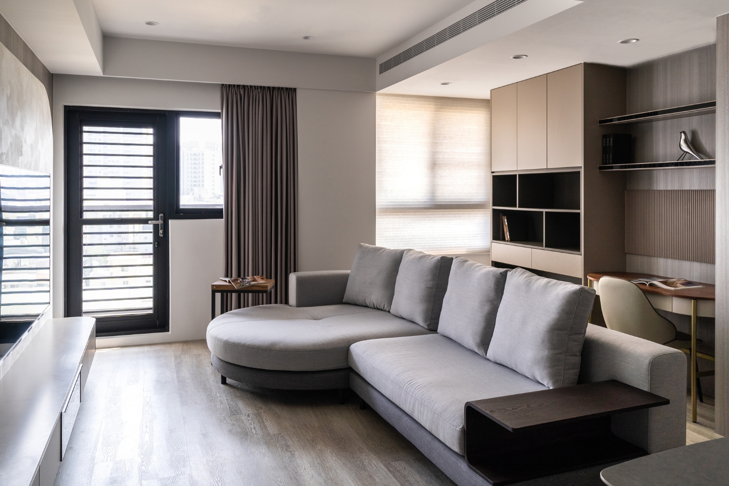使用組合式沙發作為自然分隔,劃分生活區與工作區。