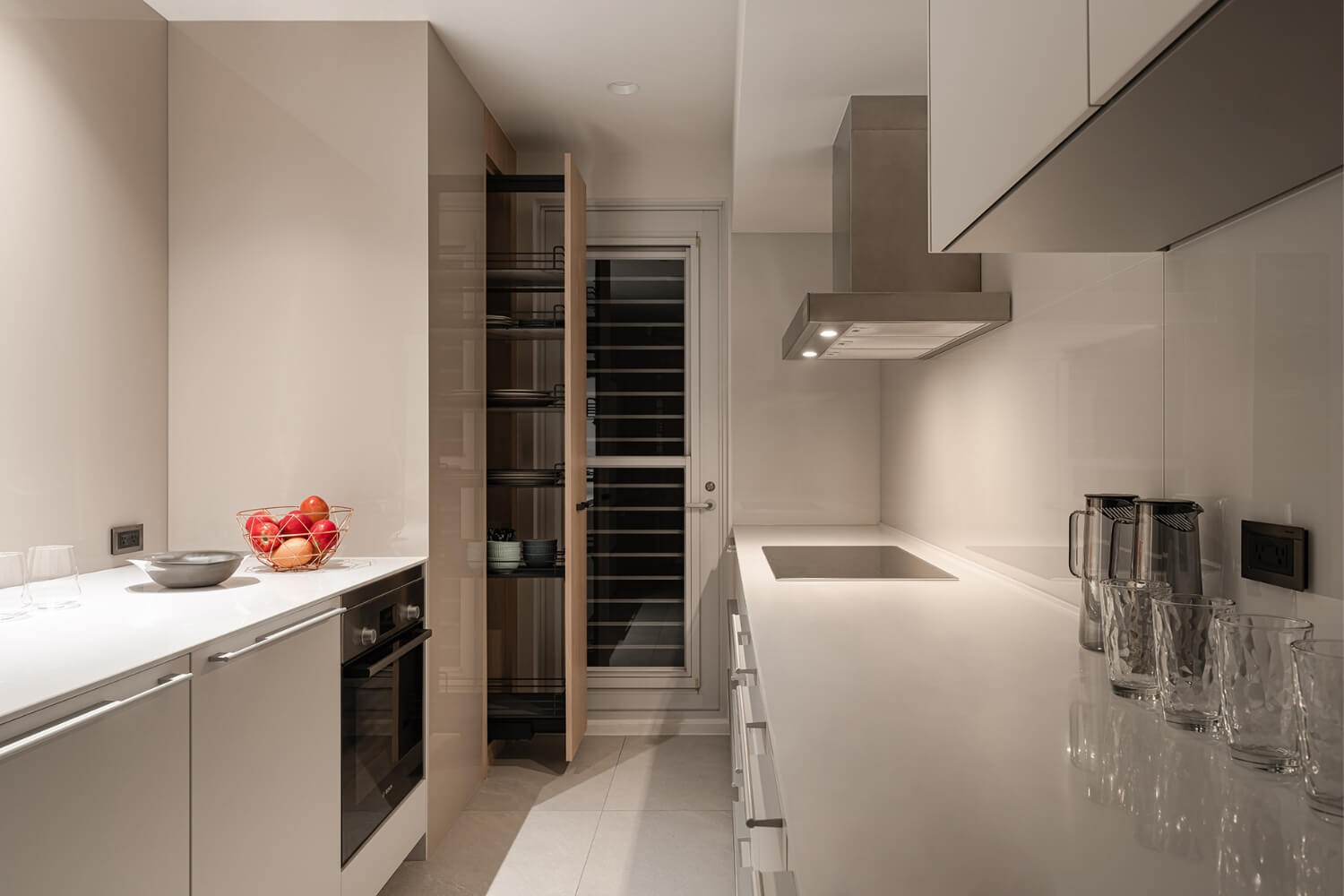 在廚房空間中,系統家具的主要功能是什麼? | 在廚房中設置系統櫃、拉伸式抽屜、吊櫃等系統家具,能在維持空間整潔與美觀的前提下,提升廚房的收納效能。 |