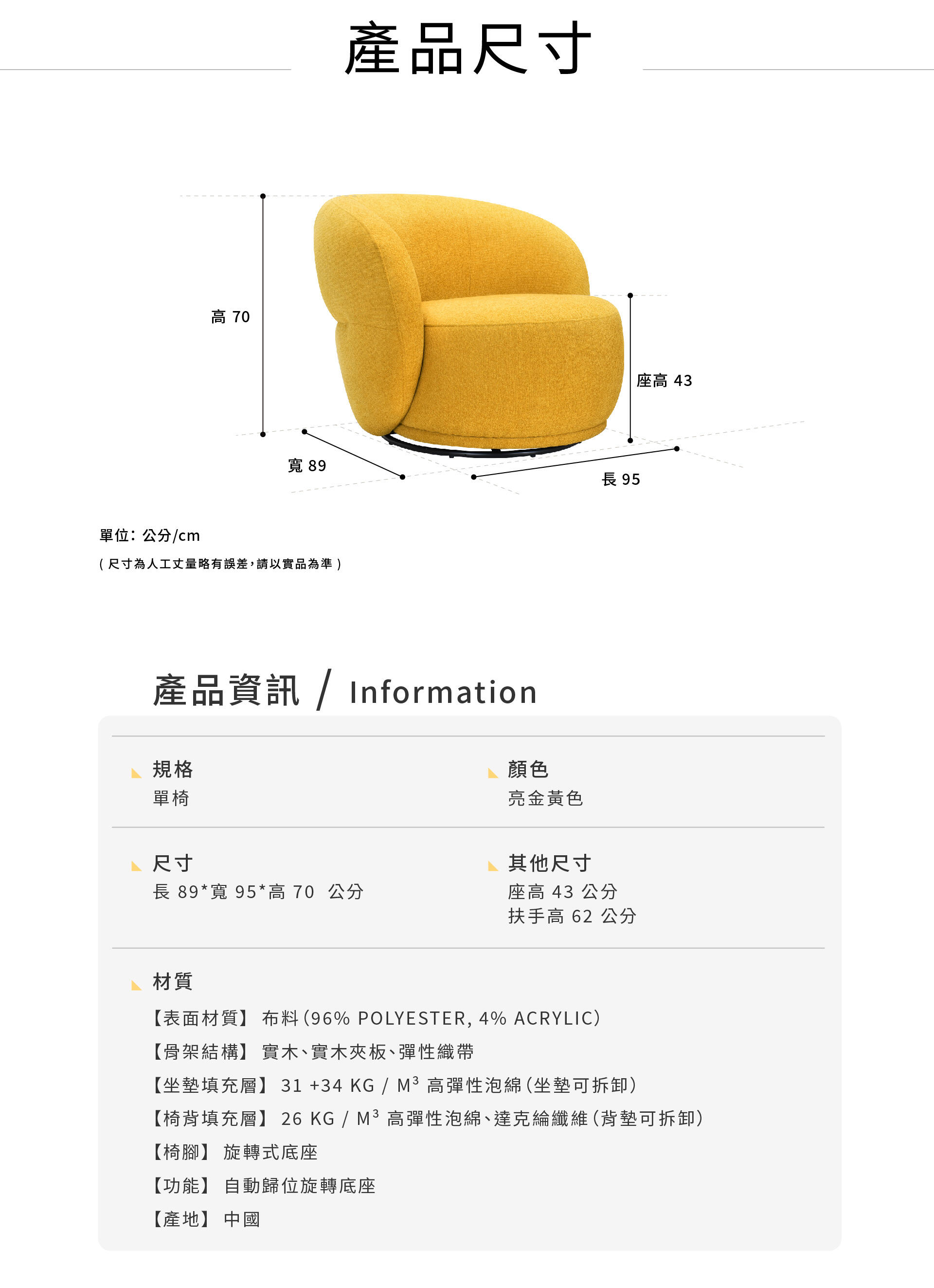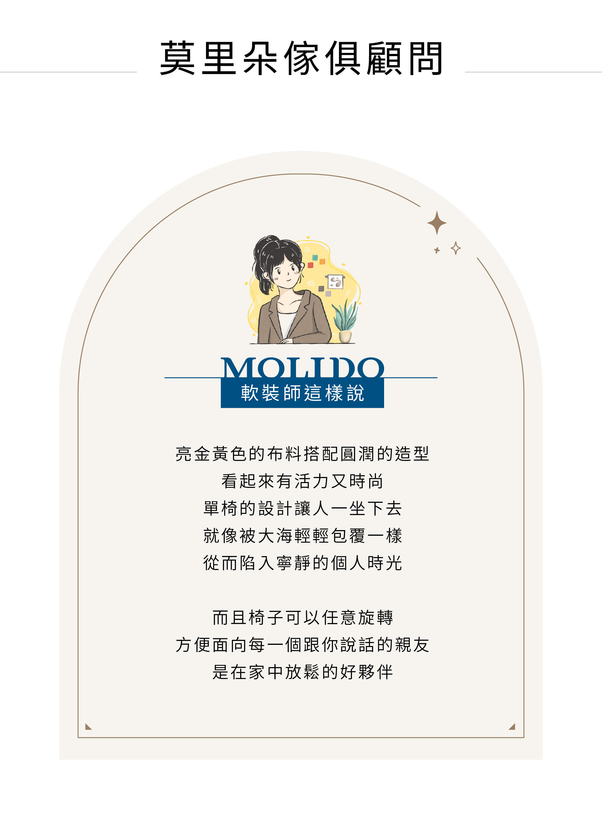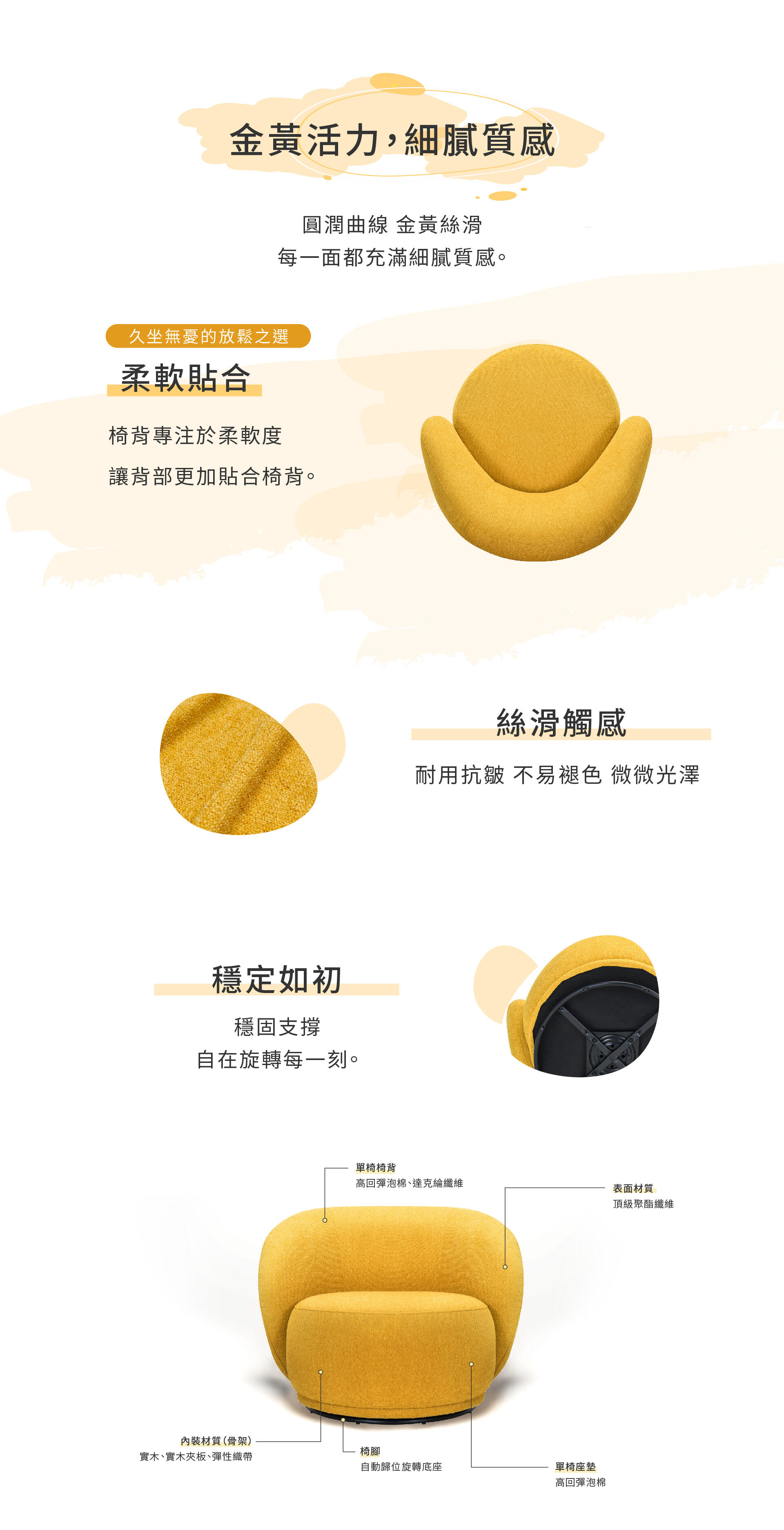 - 椅子外觀以現代極簡風格為主,圓潤曲線與明亮的金黃色布料為家居空間增添活潑且優雅的氣息。