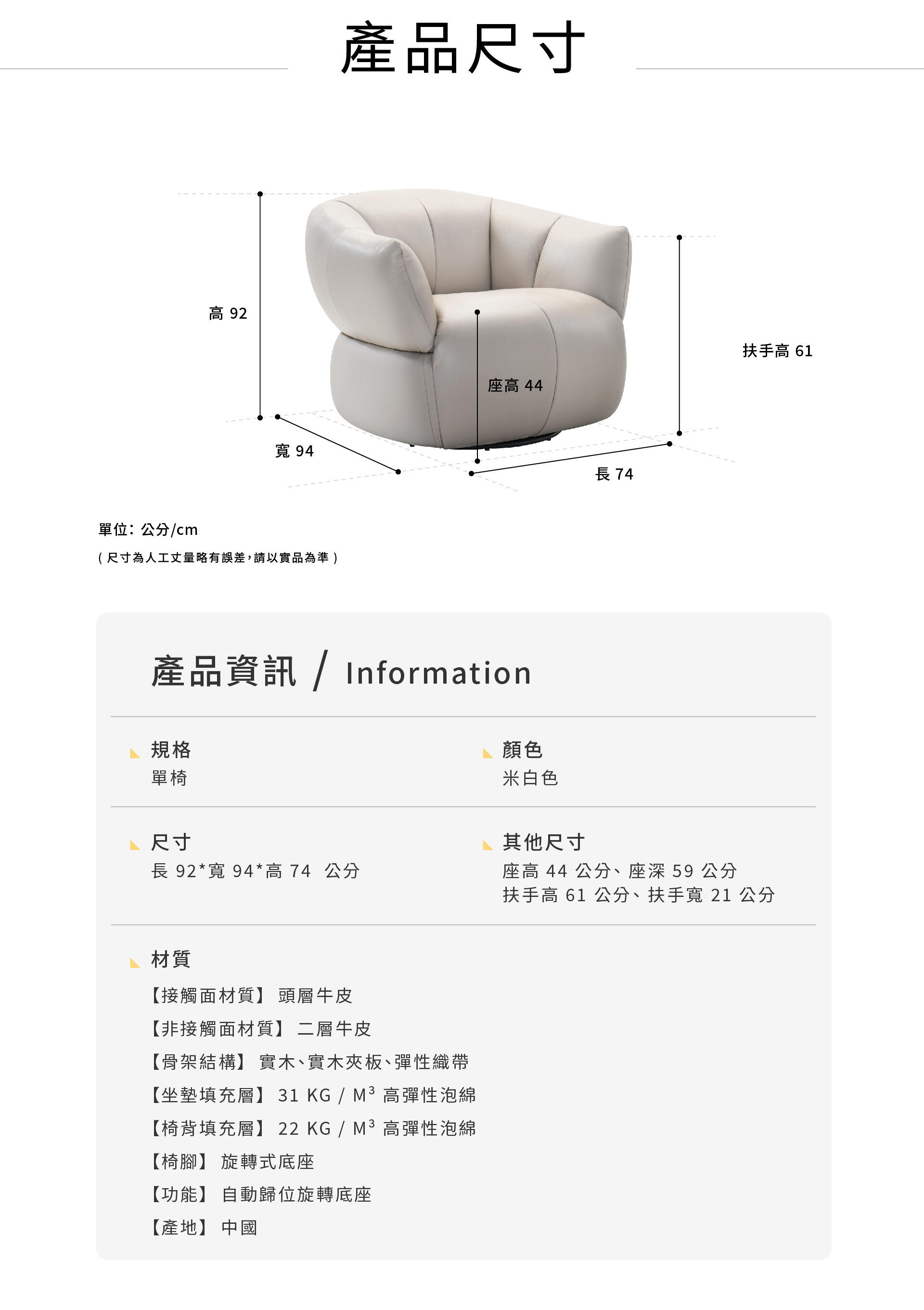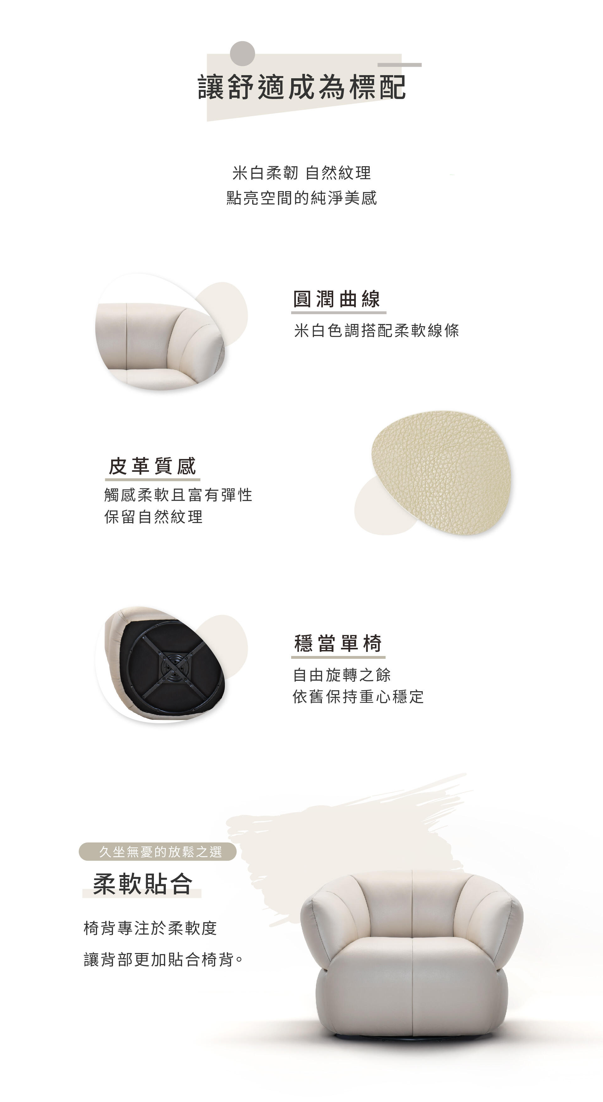 - 圓潤的視覺感受,米白色調搭配柔軟線條,是一款簡約大方的單椅。