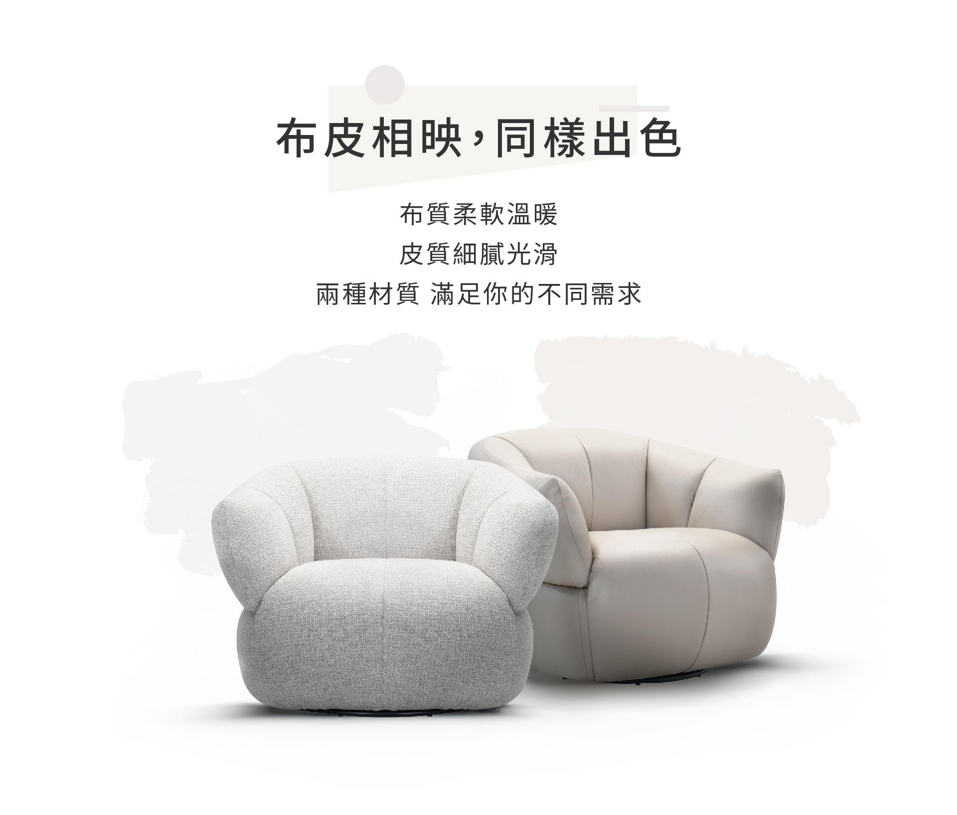 可客製材質與布色;若喜歡布藝風格,可參考 Moo 可旋轉布料單椅