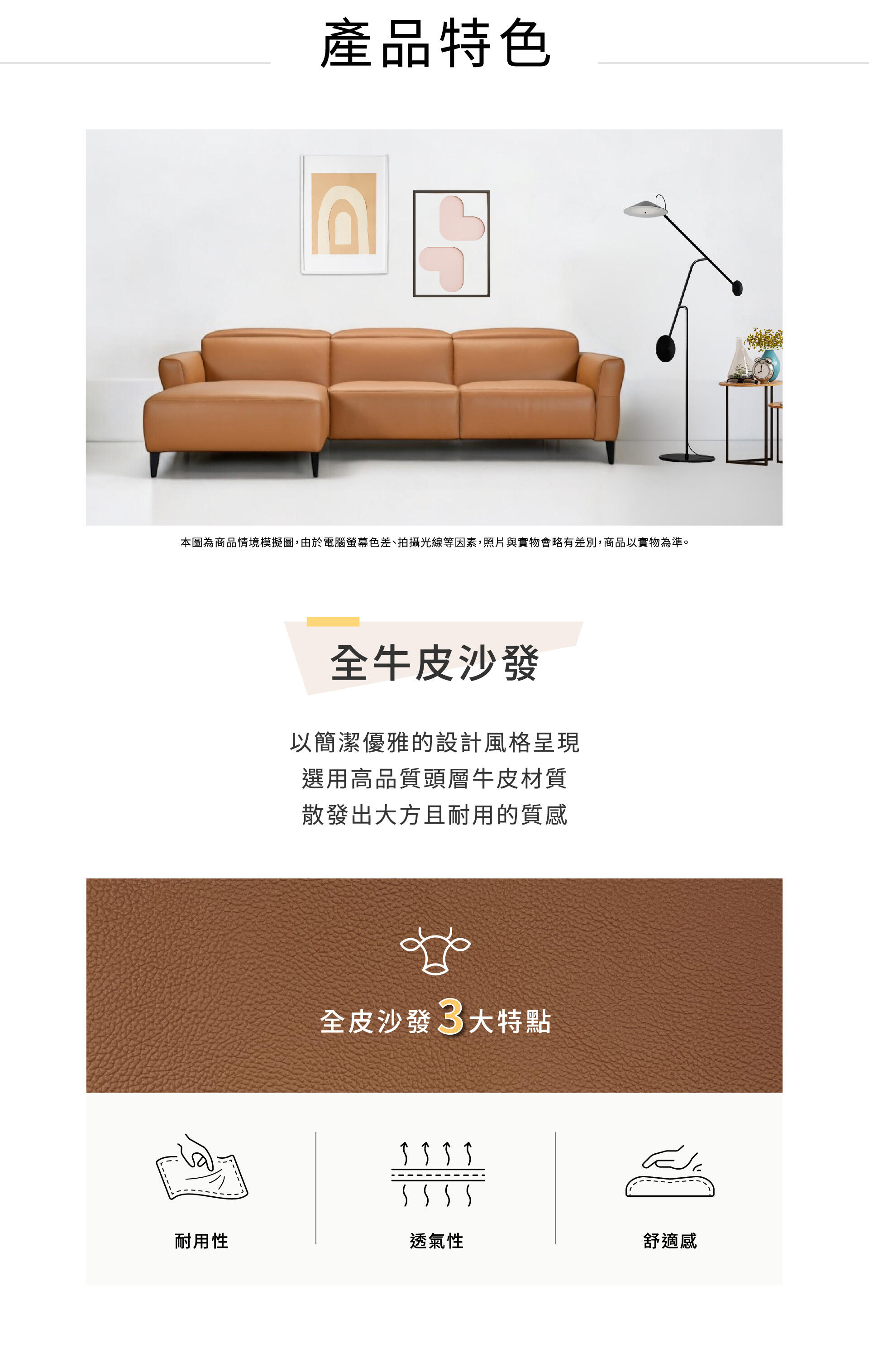 這款「全牛皮沙發」以簡潔優雅的設計風格呈現,選用高品質頭層牛皮材質,散發出大方且耐用的質感。