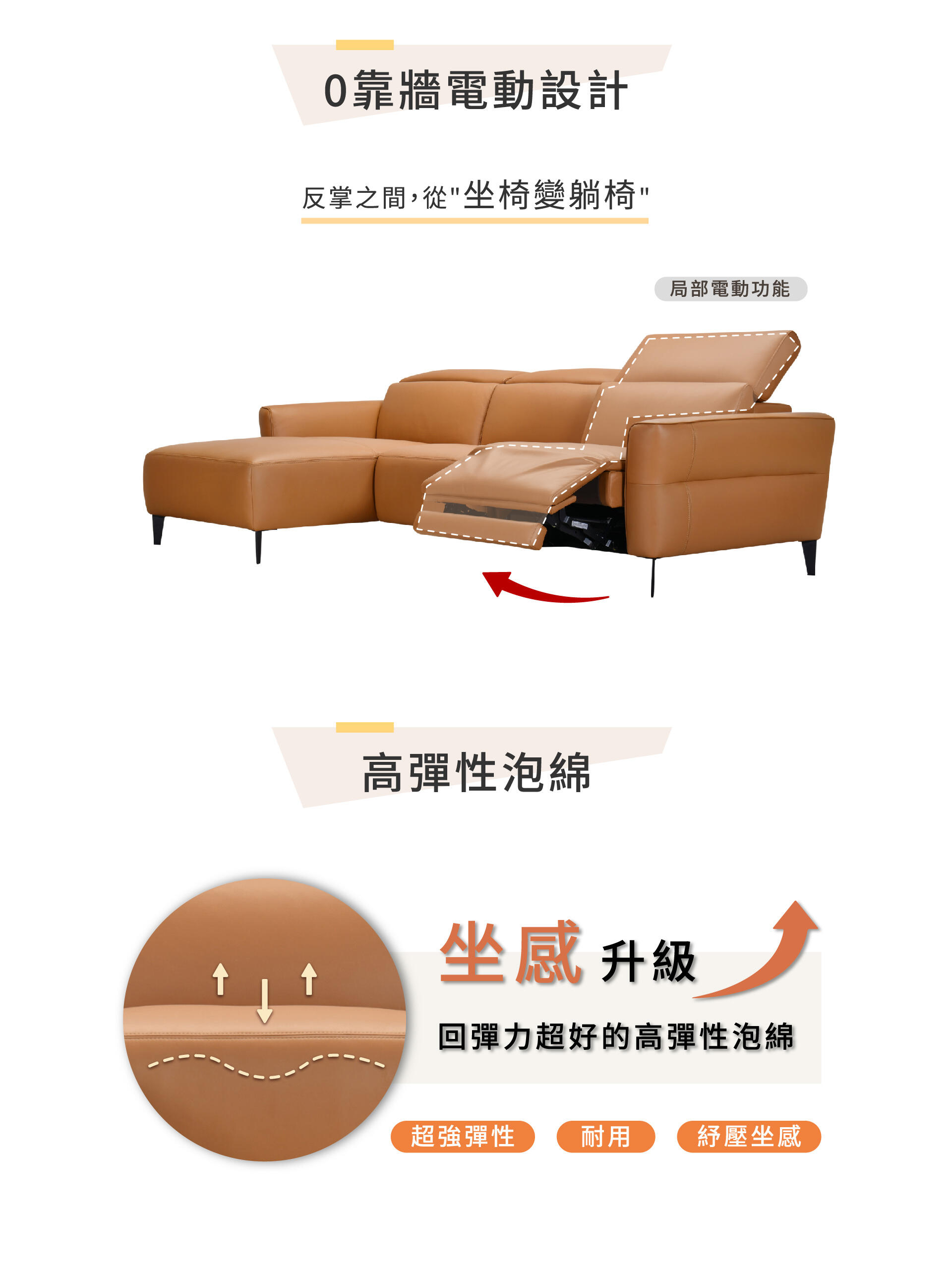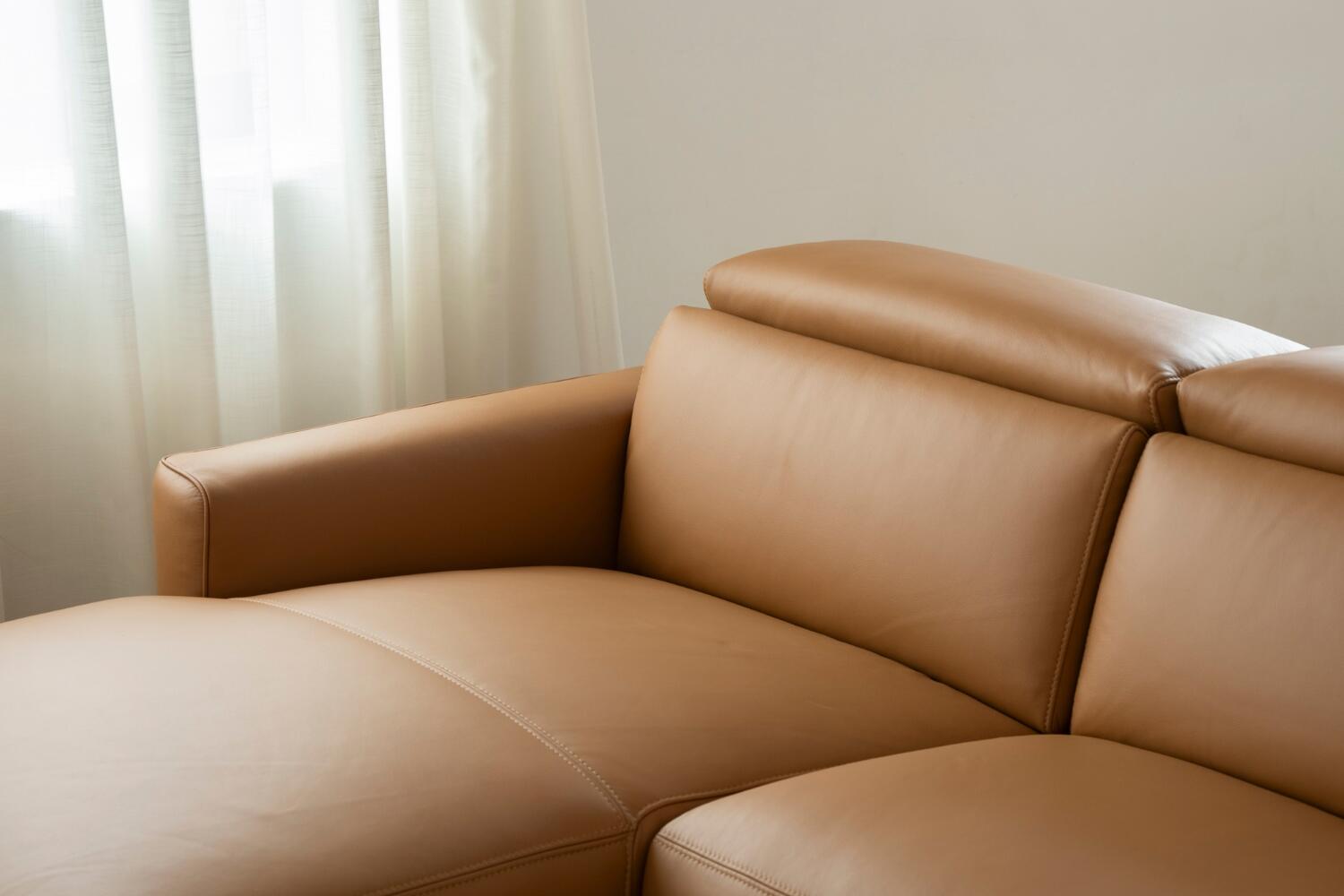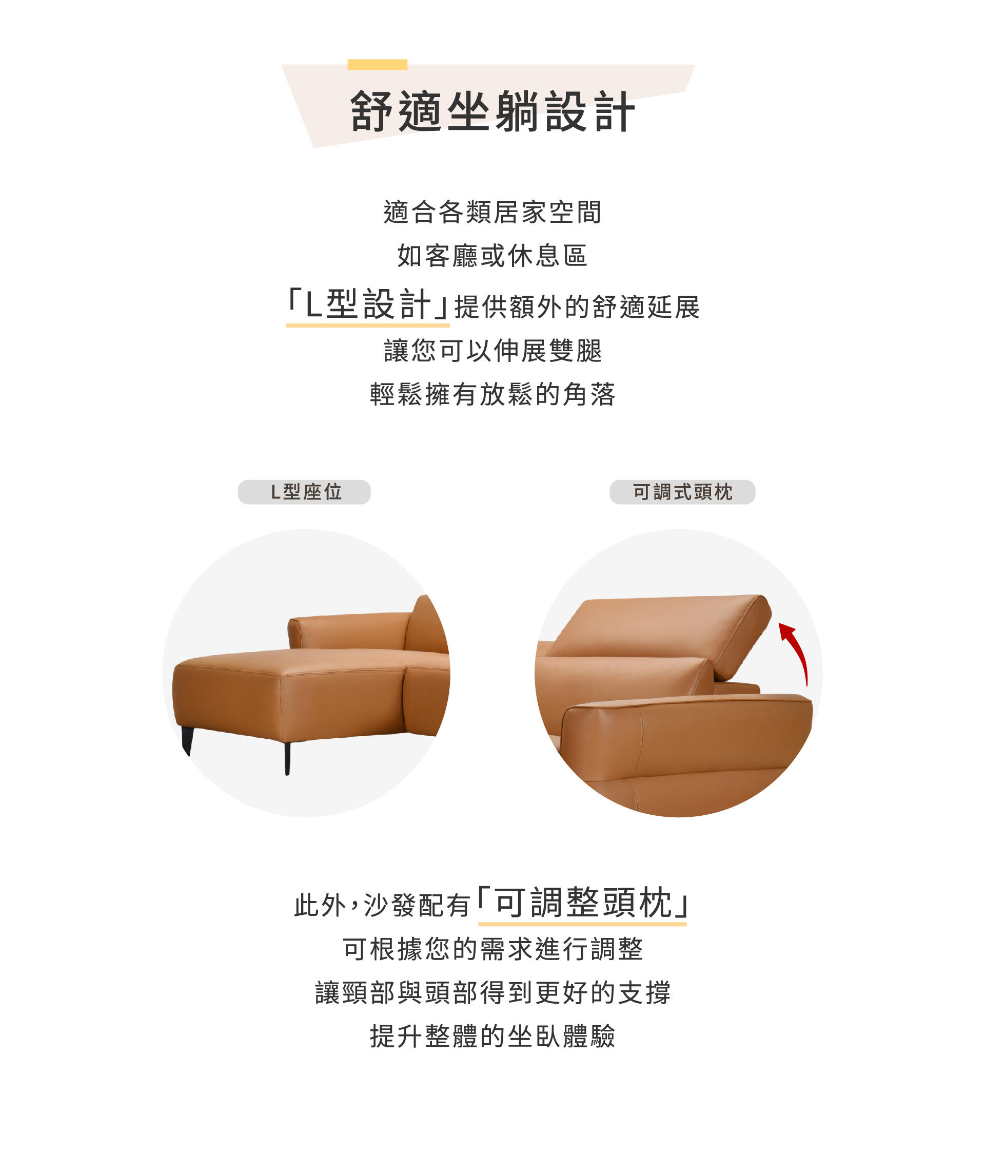 此外,沙發配有「可調整頭枕」,可根據您的需求進行調整,讓頸部與頭部得到更好的支撐,提升整體的坐臥體驗。