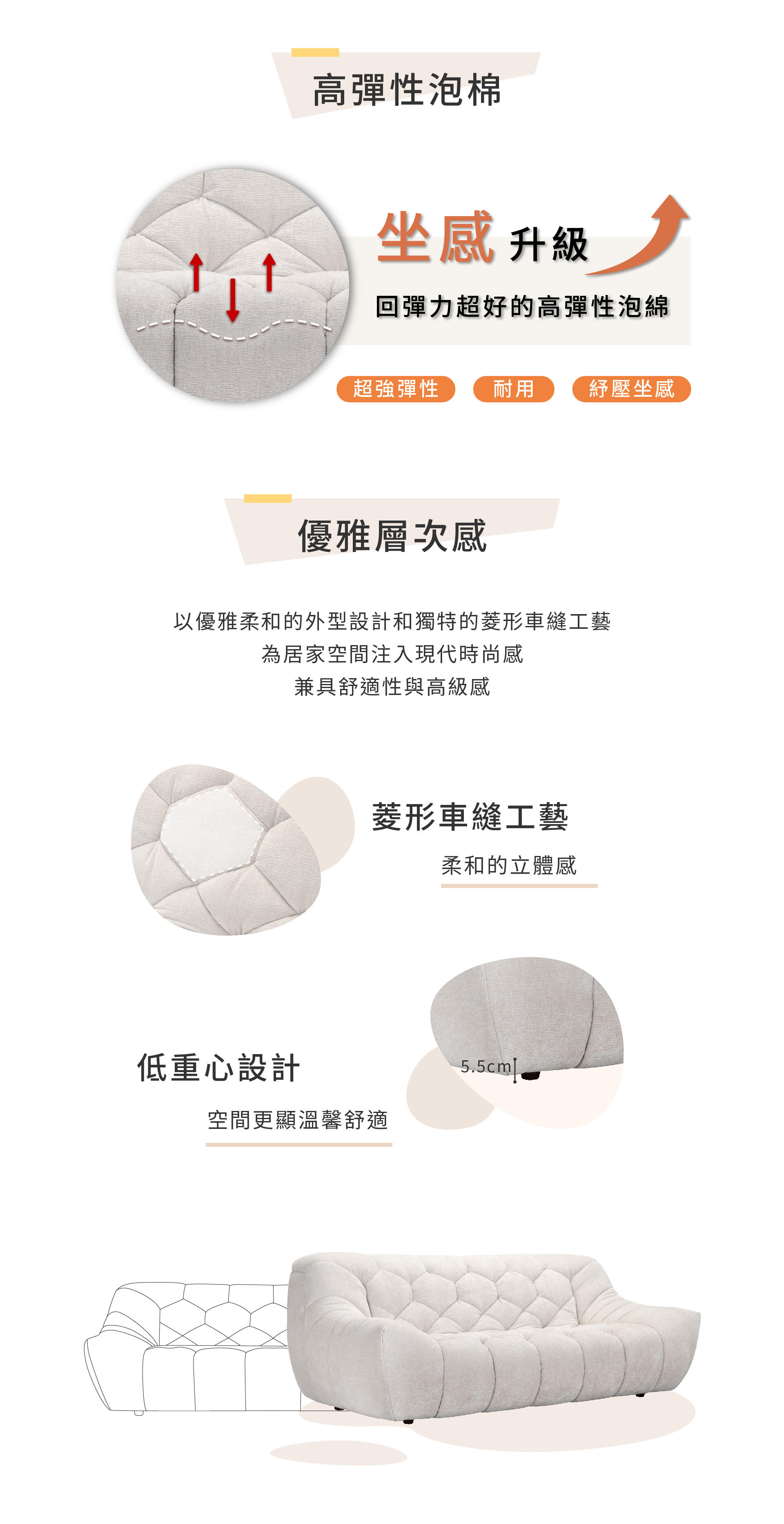極簡菱形設計:沙發表面的菱形車縫細節,營造出柔和的立體感,讓整體造型更具層次。