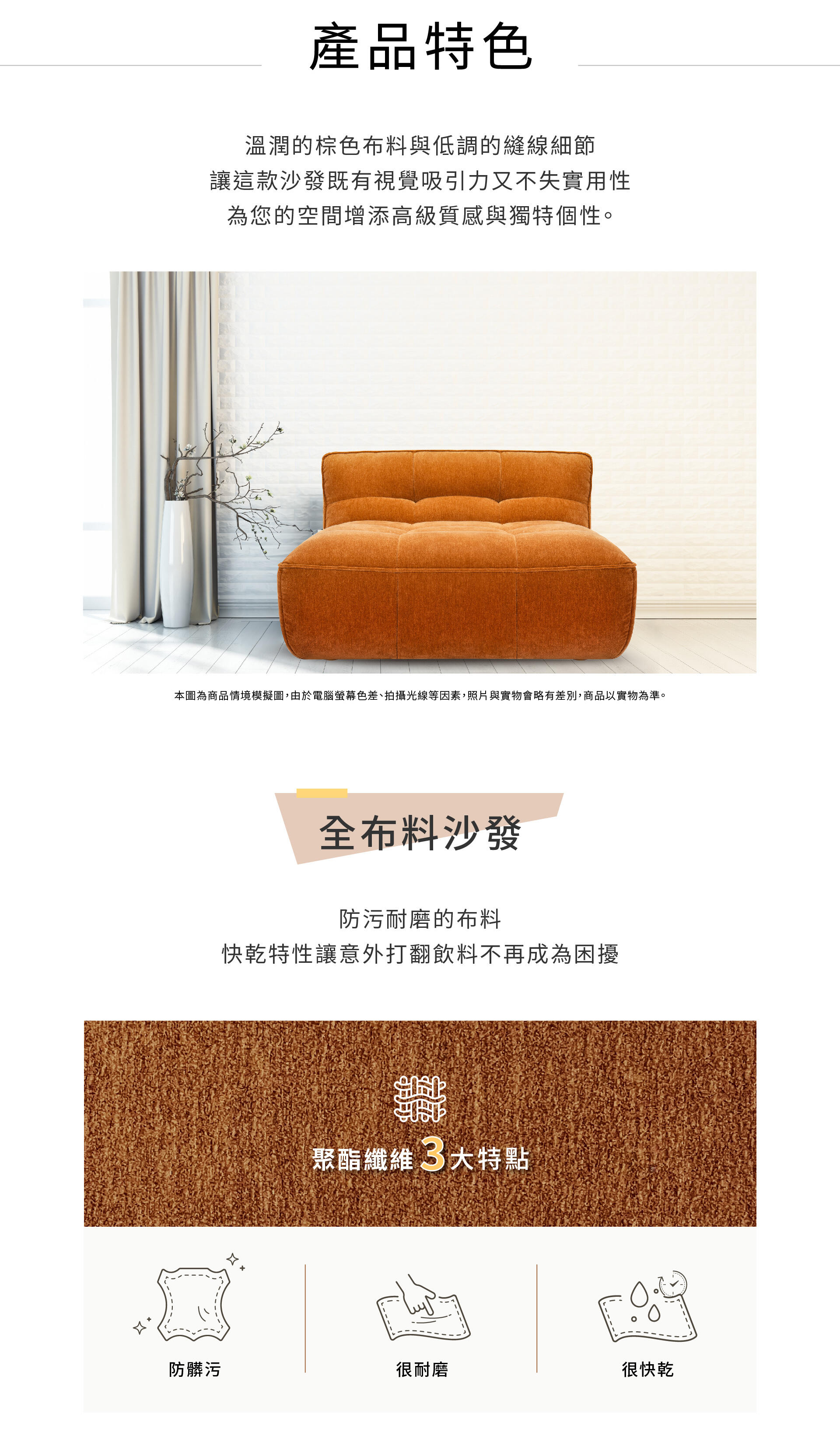 溫潤的棕色布料與低調的縫線細節讓這款沙發既有視覺吸引力又不失實用性,為您的空間增添高級質感與獨特個性。